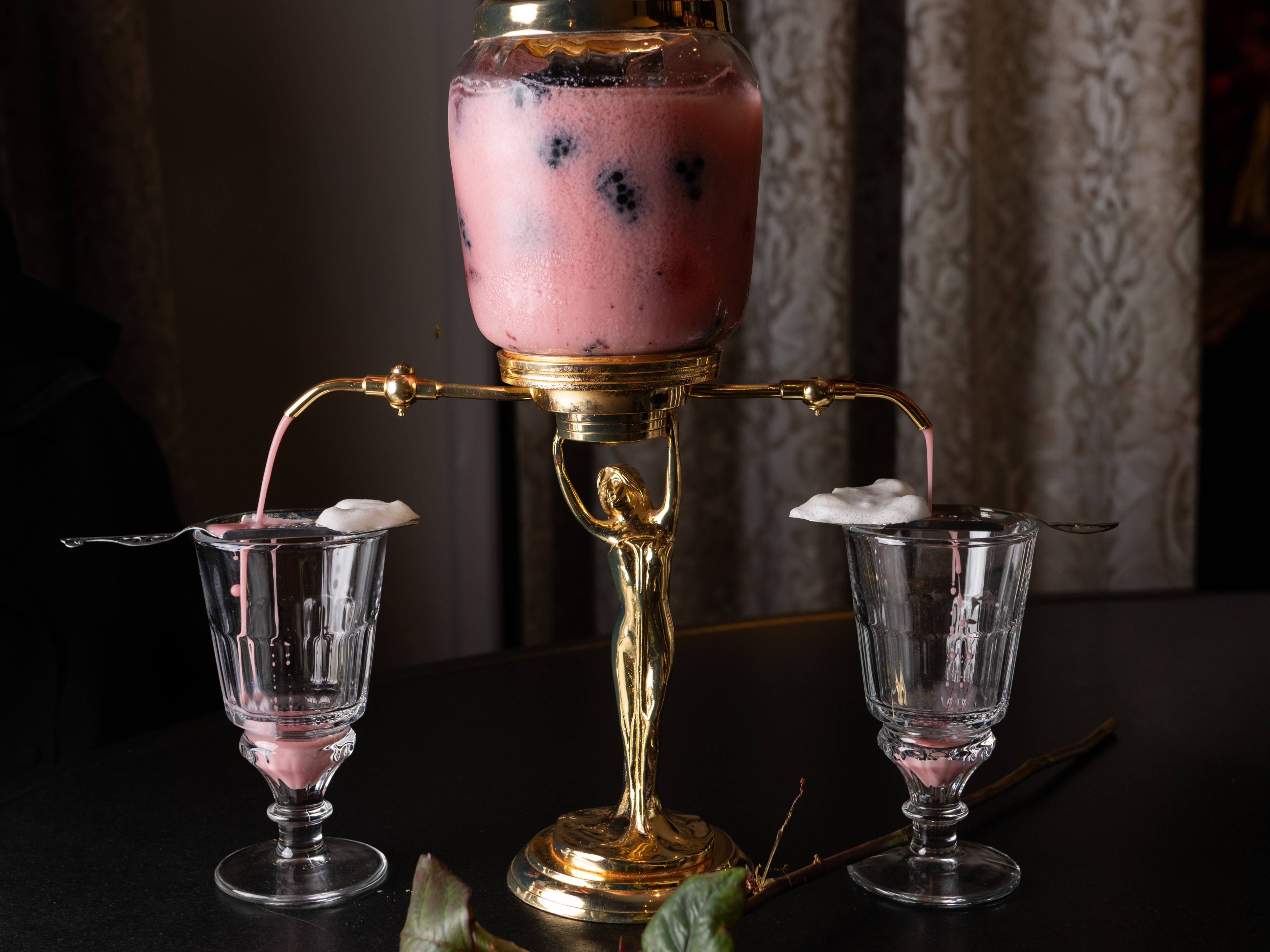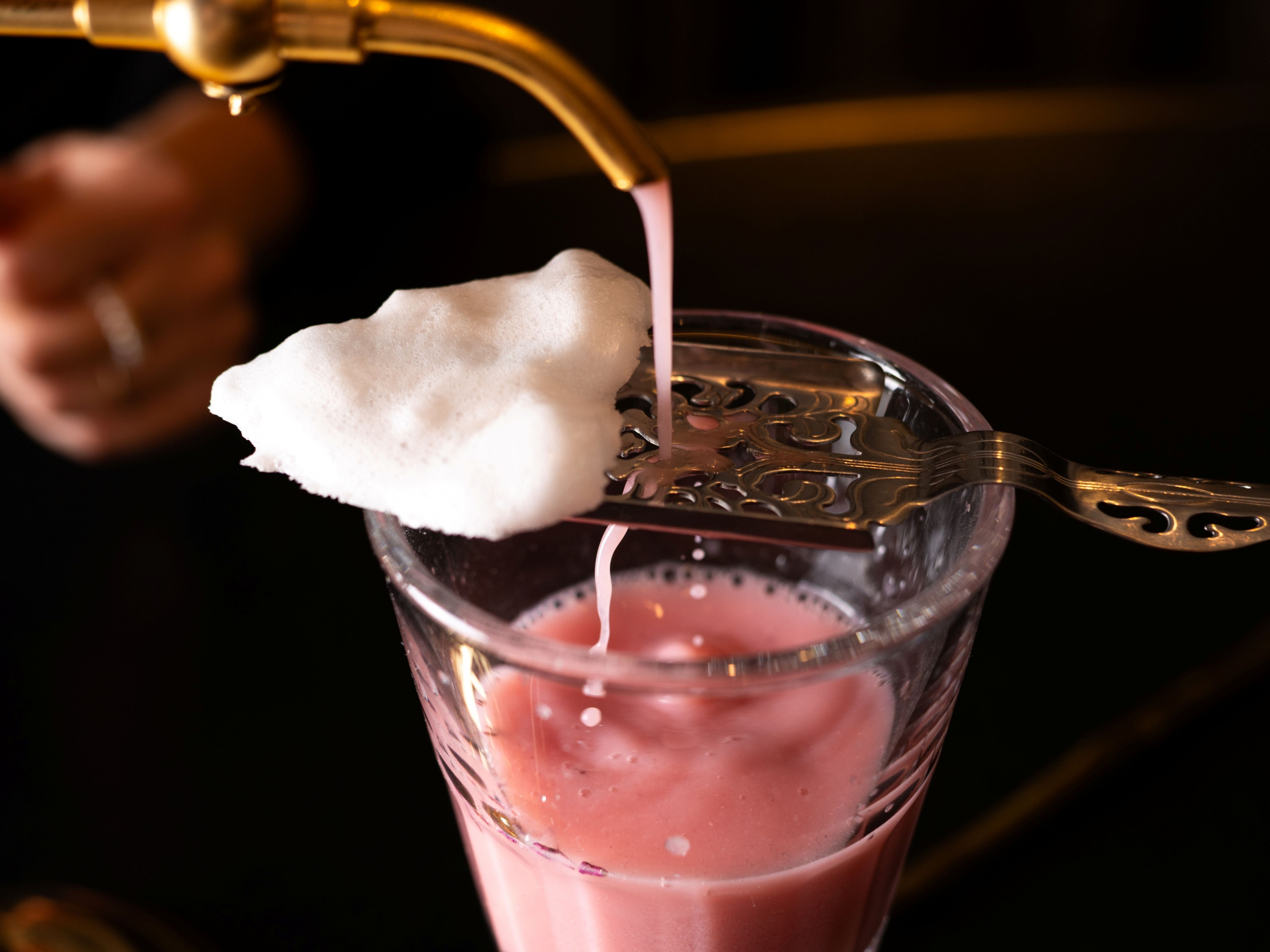 Conceived as a poetic nod to Charles Baudelaire, the Lovers’ Elixir is designed for two. Served in an absinthe fountain, its delicate blush hue unveils a subtle balance of freshness, roundness and floral notes, blending gin, elderflower liqueur, red berries and a whisper of absinthe, a cocktail best enjoyed eye to eye.